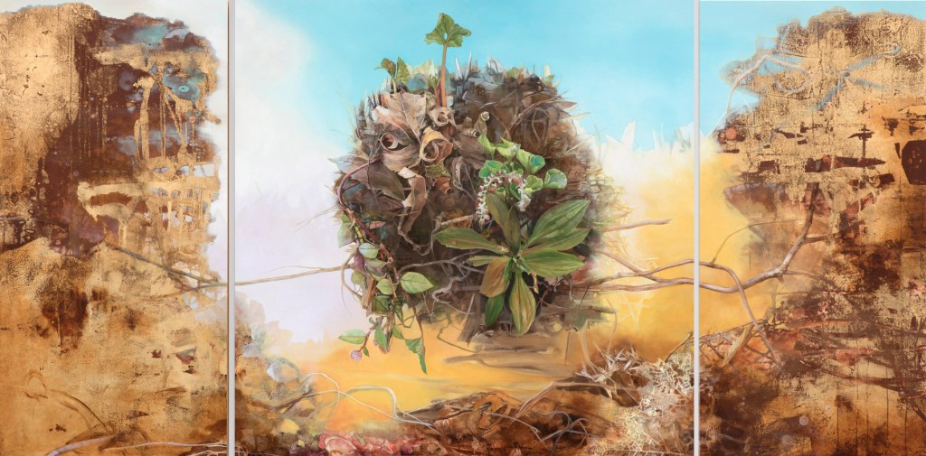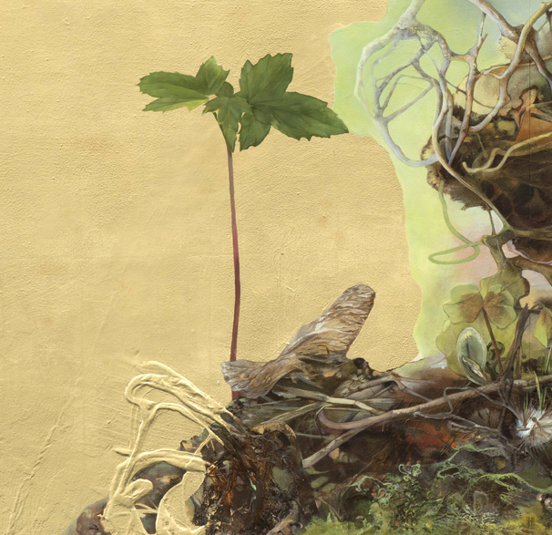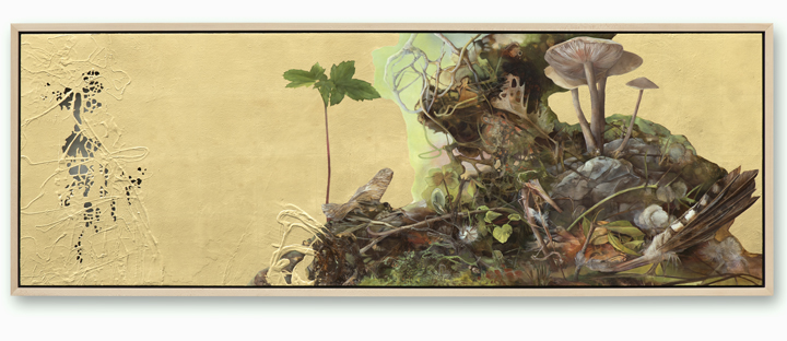 “Sprout & Wing” Oil/metal leaf/cut-work on birch panel 23″ x 67″ 2017