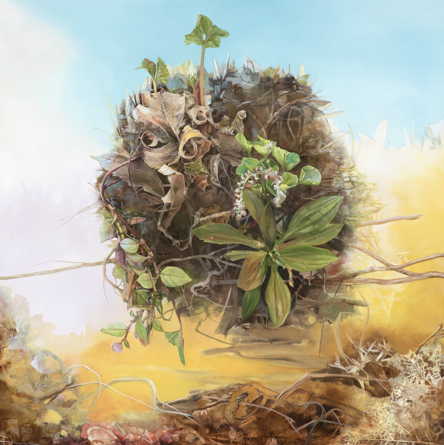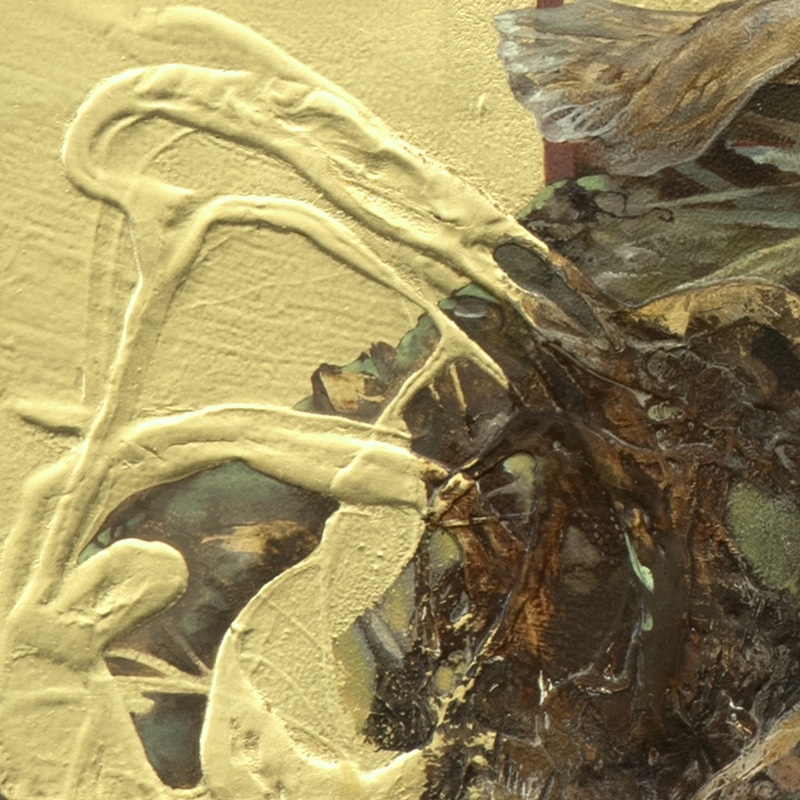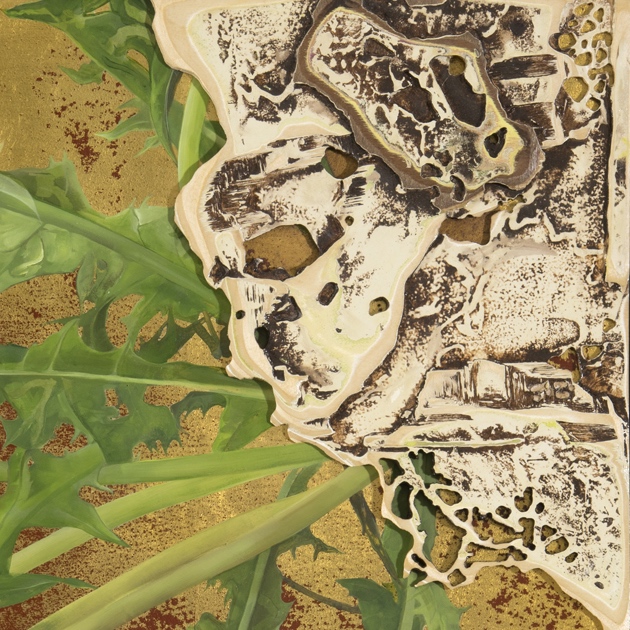 “Queen Dandelion” oil/metal leaf/cutwork on layered panel
